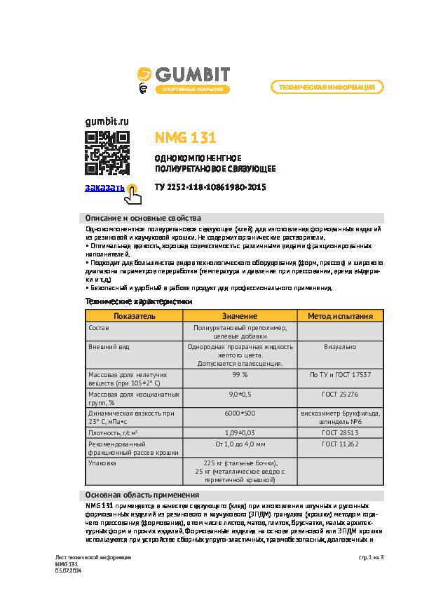 Полимерное связующее. Предназначено для создания спортивных покрытий из резиновой крошки. Хорошо взаимодействует с наполнителем даже при низких температурах — от 3 °C.